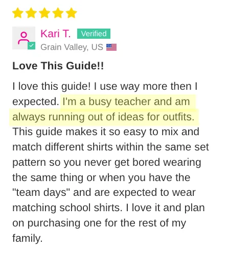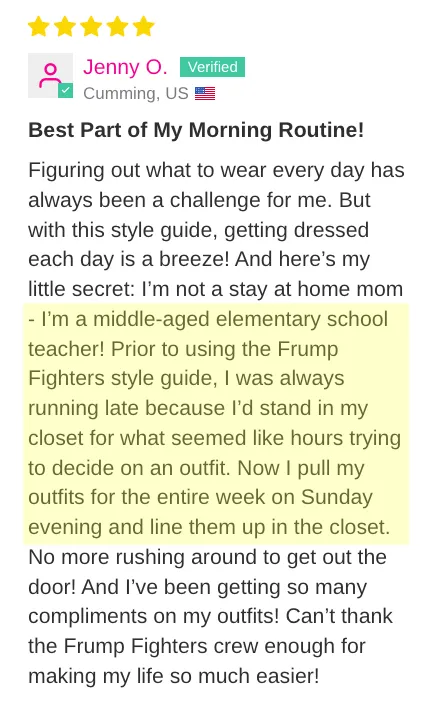 "I’m a middle-aged elementary school teacher...Prior to using the Frump Fighters style guide, I was always running late because I’d stand in my closet for what seemed like hours trying to decide on an outfit. Now I pull my outfits for the entire week on Sunday evening and line them up in the closet. No more rushing around to get out the door! And I’ve been getting so many compliments on my outfits! Can’t thank the Frump Fighters crew enough for making my life so much easier!"