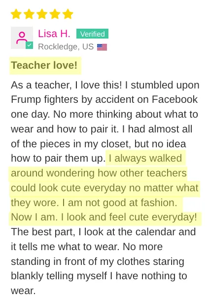 "As a teacher, I love this! I stumbled upon Frump fighters by accident on Facebook one day. No more thinking about what to wear and how to pair it. I had almost all of the pieces in my closet, but no idea how to pair them up. I always walked around wondering how other teachers could look cute everyday no matter what they wore. I am not good at fashion. Now I am. I look and feel cute everyday! The best part, I look at the calendar and it tells me what to wear. No more standing in front of my clothes staring blankly telling myself I have nothing to wear."